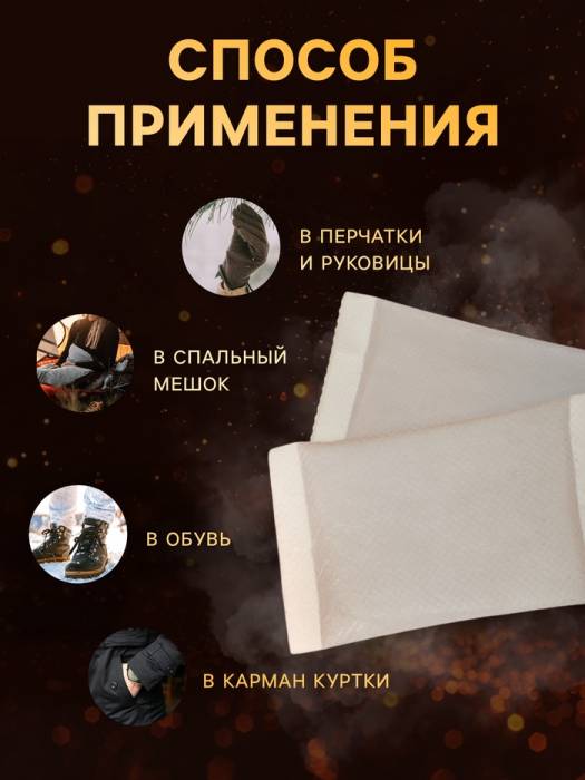 Самонагревающиеся грелки позволят Вам легче перенести морозы. Способ применения прост. Начинают работать при взаимодействии с воздухом.