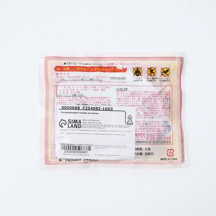 Во избежание ожогов нельзя приклеивать пластырь на кожу, только на наружную сторону носков. Нельзя использовать во время сна. Запрещено использовать беременным женщинам и младенцам. Людям, страдающим диабетом, нарушением кровообращения, болезнями кожи, использовать только под руководством врача. Если вы испытываете дискомфорт, немедленно удалите его.