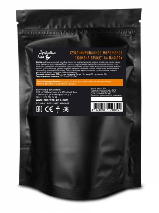 Мороженое пломбир в брикете – это готовая сублимированная туристическая еда для быстрого приготовления в походных условиях. Питание и десерты можно взять с собой в дорогу, в поход, на дачу, в летний лагерь. Такая необычная, немного космическая походная пища отлично заменит традиционные консервы или сухой паек. Сухое ванильное мороженое занимает мало места и не требовательно к условиям хранения. Сублиматы для туризма от российского бренда «Здоровая еда» продаются в порционных термоустойчивых пакетах. Откройте пакетик и попробуйте вкусный десерт на завтрак или обед туриста.