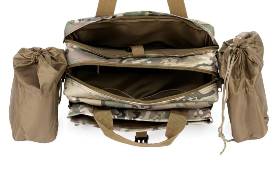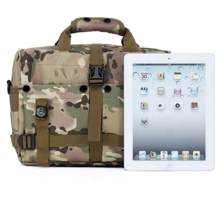 Тактический портфель с камуфляжным узором выполнен из прочного материала и оснащен регулируемыми ремнями, ручкой для переноски и небольшим встроенным компасом.